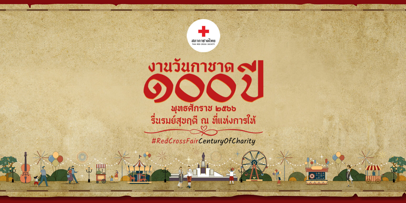 งานวันกาชาด 100 ปี พุทธศักราช 2566 ภายใต้แนวคิด “รื่นรมย์สุขฤดี ณ ที่แห่งการให้” #RedCrossFairCenturyOfCharity เชิญชวนร่วมย้อนวันวานไปกับมหรสพรื่นเริงการกุศลคู่คนไทยที่กำลังหวนกลับมาอีกครั้งให้หายคิดถึง…ที่ที่เต็มไปด้วยความสนุกสนานรื่นรมย์และความสุขจากการได้มาเที่ยวงานกาชาด